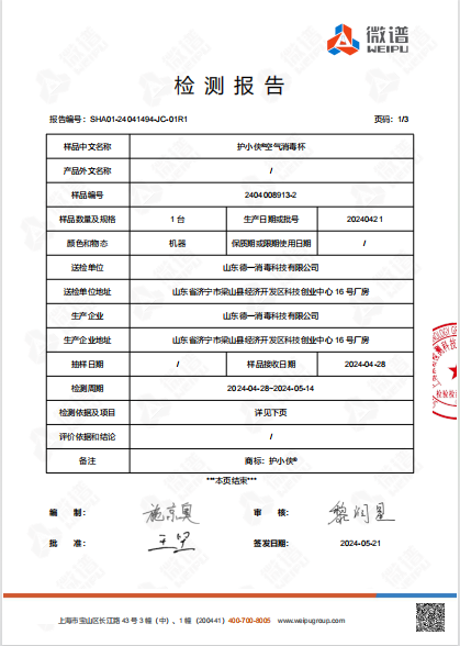護(hù)小俠空氣消毒杯檢測報(bào)告